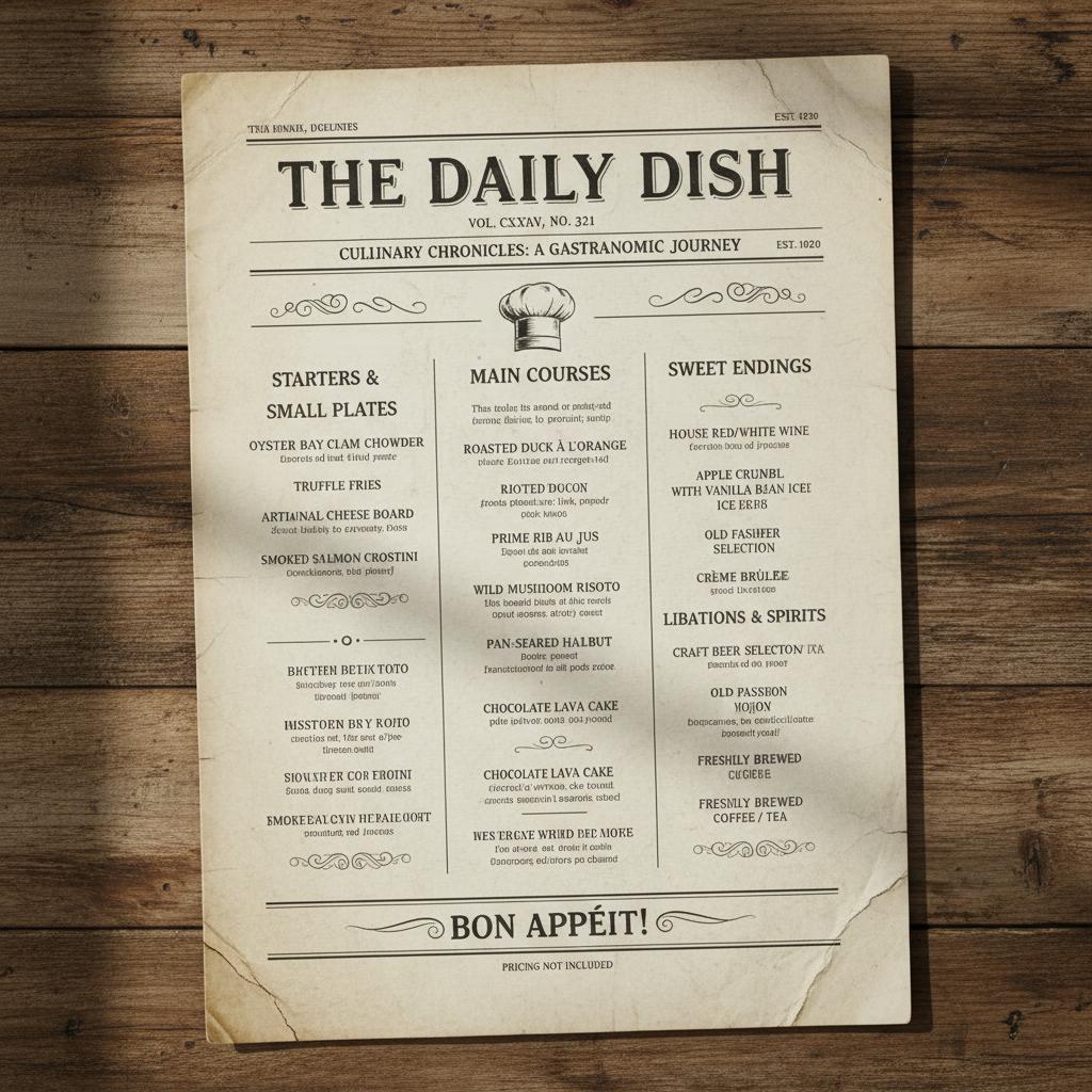 05.02.2026 Меню на газетной бумаге! У нас вы можете быстро напечатать меню кафе или ресторана на газетной бумаге. Удивите гостей с первых же минут. Срок изготовления 1-2 рабочих дня! Звоните! Предыдущая новость Возьми 3 по цене 1!